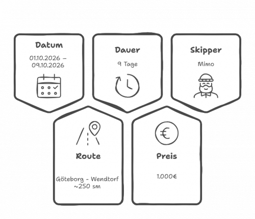 Die ersten Etappen führen uns durch die faszinierende Schärenlandschaft der schwedischen Westküste. Diese zerklüfteten Inseln bieten eine einzigartige Kulisse und idyllische Ankerplätze, die zum Verweilen einladen. Weiter geht es über die offene Ostsee, wo wir die Weite des Meeres genießen und bei klarem Wetter fantastische Ausblicke auf die Küstenlinie erleben.