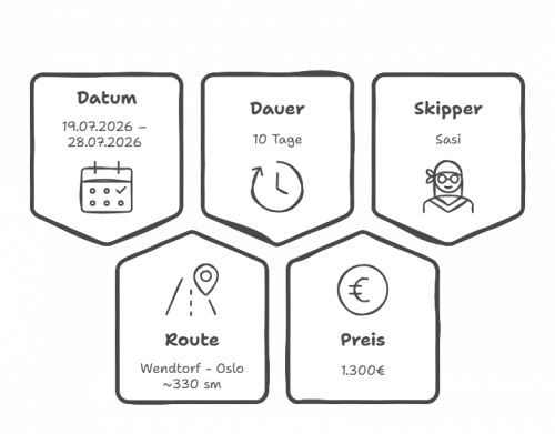 Durch die dänische Inselwelt segeln wir hoch in den Kattegat, wo wir weiter über die westschwedischen Schären nach Oslo nordwärts fahren. Je nach Wind planen wir unsere In- & Offshore Passagen und werden 2-3 Nachtfahrten absolvieren. Man sollte von sich selbst wissen, dass man sich auf einem Segelboot wohlfühlt, seglerische Vorkenntnisse sind nicht notwendig und werden an Bord beigebracht.